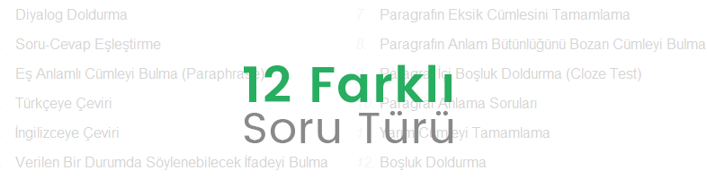 Standart İngilizce sınavlarında sorular belli bir grup Soru Türünden gelir.